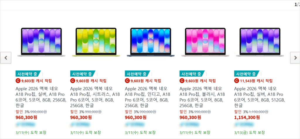 [알아보기] 쿠팡 맥북 네오 사전예약 혜택보기 (할인, 쿠팡캐시 등) by inpages · Published 2026년 03월 08일 · Updated 2026년 03월 08일 쿠팡 사전예약 페이지 상세보기 많은 분들의 관심을 받았던 MacBook Neo(맥북 네오) 제품 관련한 쿠팡 사전예약 정보입니다. 사전예약 일정, 배송일, 맥북 할인, 캐시적립, 추가보상 이벤트 등의 정보를 놓치지 마세요! 맥북 네오 사전예약 일정 사전예약 기간: 2026년 3월 6일(수) 10시 00분 ~ 3월 10일(화)배송예정일 : 2026년 3월 11일(수) 08시00분부터 순차 배송 *배송예정일은 구매하는 옵션 및 배송지역에 따라 달라질 수 있습니다.*정확한 정보는 주문/결제 페이지에서 확인 가능합니다.*1차 배송 물량은 새벽배송 불가합니다. 쿠팡 맥북 네오 사전예약 혜택 전 고객 3% 즉시할인맥북 네오 사전예약 시, 쿠팡 회원 누구나 3% 즉시할인이 적용됩니다.전 고객 쿠팡캐시 1% 적립결제완료한 금액의 1%를 쿠팡캐시로 적립됩니다.쿠팡캐시는 배송완료일 기준으로 7일 후 자동으로 적립됩니다.쿠팡캐시 유효기간은 지급일로부터 6개월입니다.와우전용 쿠팡캐시 최대 1.8만원 추가적립와우멤버십 회원이 행사기간 내 맥북 네오를 사전예약 구매할 경우, 쿠팡캐시를 최대 1만 8천원 추가 지급합니다.적립률은 구매하시는 제품의 저장용량에 따라 다릅니다.256GB 저장용량 구매 시: 와우회원 16,197원 추가적립512GB 저장용량 구매 시: 와우회원 18,257원 추가 적립정확한 적립률은 사전예약 상세안내 페이지를 확인해 주세요.애플케어플러스 20% 할인쿠팡에서 맥북 네오 신제품을 애플케어플러스 번들 옵션과 동시에 구매할 경우, 애플케어플러스 비용의 20%를 즉시 할인받습니다.혜택 적용가: 209,000원 → 167,200원맥북 중고보상 판매 시, 최대 3만원 추가보상 지급혜택 및 대상: 이벤트 기간 기간 내 맥북 네오 모델을 사전예약 구매 완료하고, 추가보상 대상 모델을 3월 22일까지 중고보상 접수 완료한 고객을 대상으로 일반보상금 외 3만원 추가보상을 지급합니다.이벤트 기간: 2026.03.04~2026.03.10반납 모델 시리즈: MacBook 전 모델추가보상금은 4월 14일 일괄 지급됩니다.단, 추가 보상 이벤트 참여를 위해서는 반드시 주문완료 후, 정해진 방법에 따라 마이쿠팡에서 중고보상 프로그램 신청을 완료해 주셔야 합니다. *독자 편의를 위해 프로모션 내용을 축약 정리한 것입니다. 자세한 내용은 공식 홈페이지를 확인해 주세요.*혜택 내용은 업체 사정에 따라 예고 없이 변동될 수 있습니다. 쿠팡 사전예약 페이지 상세보기 ▼ ▼ ▼ ▼더 다양한 내용은 아래 페이지에서 확인 가능해요! 맥북 네오 사전예약 자세히 보기 자주 묻는 질문 (FAQ) 질문) 쿠팡에서 맥북을 구매하더라도 정품인가요?네, 정품입니다.쿠팡이 애플코리아와 공식 판매 계약을 맺은 후 애플공인리셀러 자격으로 판매하는 정품이오니, 안심하셔도 됩니다.질문) 맥북 네오 사전예약 시, 키보드는 어떤 언어로 각인되어 배송되나요?쿠팡에서 맥북 사전예약 구매 시, 한글과 영어가 함께 각인된 키보드로 배송됩니다.사전예약 기간 중에는 다른 키보드 자판으로 변경이 어렵습니다.질문) 맥북 네오는 터치 아이디를 지원하나요?구매하시는 맥북 네오 제품의 저장용량에 따라 다릅니다.256GB: 터치 아이디 미지원512GB: 더치 아이디 지원질문) 맥북 네오 제품에는 무슨 색상이 있나요?블러시시트러스실버인디고질문) 쿠팡에서 애플케어플러스까지 함께 구매 완료한 경우, 구매자가 별도로 할 일이 있나요?없습니다.쿠팡에서 MacBook 제품과 애플케어플러스를 함께 구매 완료한 경우, 배송완료일부터 자동으로 보증 기간이 시작됩니다.다만, 구매 시 입력한 이메일 주소로 보증서가 제대로 수신되는지를 확인해 주시는 것이 좋습니다.질문) 맥북 네오 사전예약 구매 시, 언제 배송받나요?맥북 네오 제품은 정식 출시일인 2026년 3월 11일 수요일 08시 이후부터 순차 배송될 예정입니다.주문 순서에 따라 배송 순서가 달라집니다. 1차 배송 물량이 모두 소진된 이후에 주문하신 경우라면 배송 예정일이 늦을 수 있습니다.정확한 배송예정일 정보는 주문완료 후 [마이쿠팡] > [배송조회] 경로에 표시되는 내용을 확인하여 주시기 바랍니다.배송 예정일은 업체 사정에 따라 변동될 수 있습니다. 예컨대 2차 이후 예정일의 경우 물량 확보가 빠르게 이루어질 시, 더 빠르게 배송될 수도 있습니다.질문) 쿠팡이 아닌 다른 곳에서 사전예약하면 더 빠르게 받아볼 수 있나요?1차 배송일(2026년 3월 11일 08시 이후)은 모든 공식 판매처가 동일합니다.다른 판매처에서 구매한다고 해서 3월 11일 08시 이전에 배송받으실 수는 없습니다.