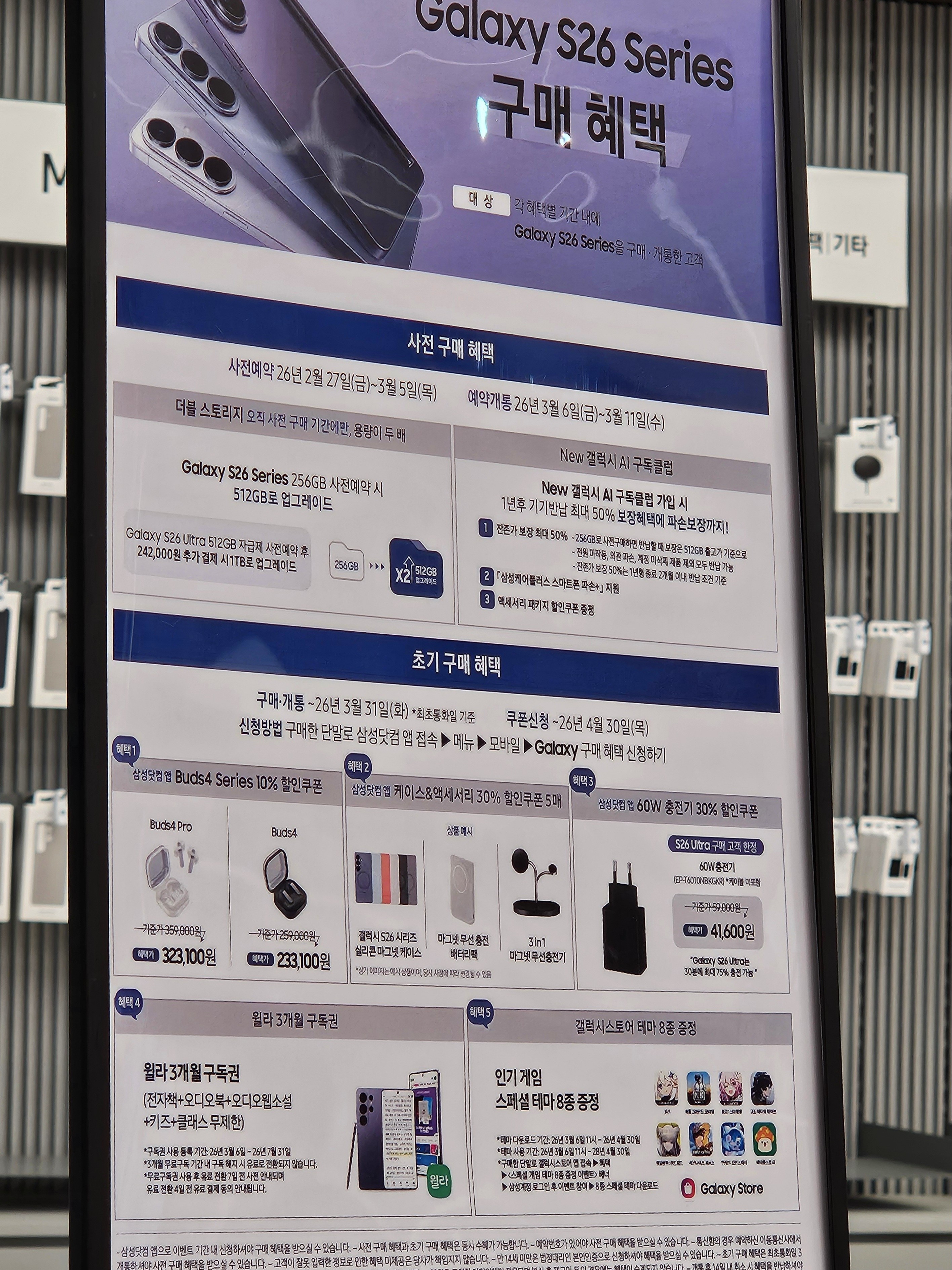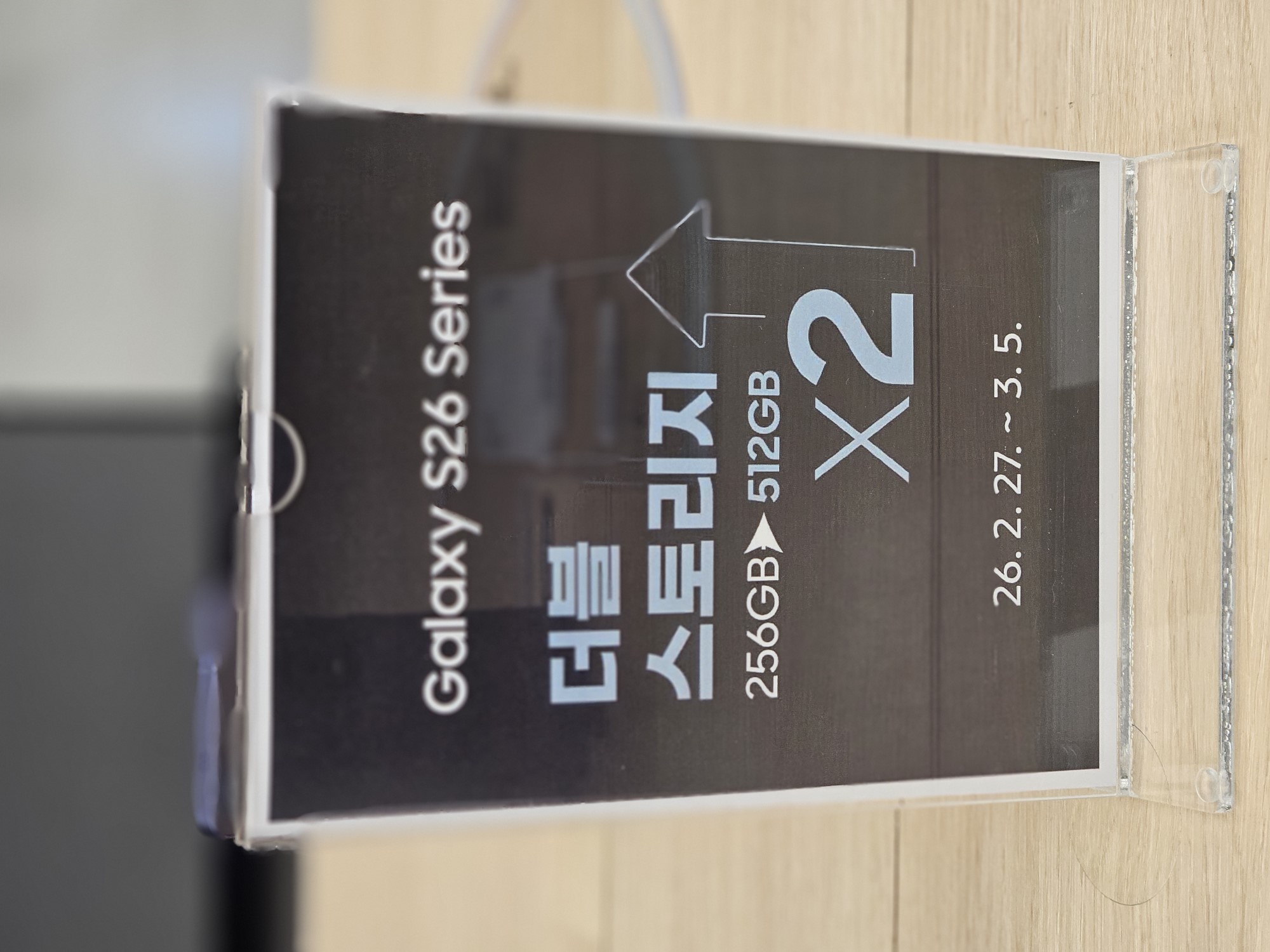 - 사전예약 시 S26 시리즈 256GB 모델은 512GB로 더블스토리지(용량 업그레이드) 혜택을 제공합니다.